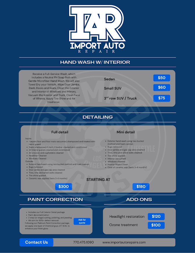 Contact Import Auto Repair today at 770-475-1090 to schedule your visit. Let our experienced team show you the difference that professional detailing makes. We look forward to serving you and helping your vehicle look its absolute best.